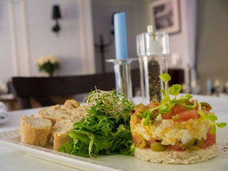 Z menu inspirowanego światem sztuki wybrałam Jajecznicę Faberge (29zł). Głównie dlatego, że niezwykle mi się spodobała nazwa. To, co dostałam zupełnie mnie zaskoczyło, nie miało bowiem nic wspólnego ze zwykle dość niezorganizowaną konsystencją jajecznicy. Był to piękny jajecznicowy torcik. Jajecznica z kurkami, pomidorami i oliwkami. Iście artystyczna. I przede wszystkim bardzo pyszna.