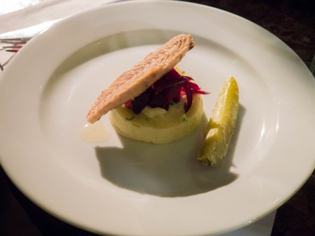 Znakomite były Filety z makreli na puree ziemniaczanym z pieczonym burakami i ogórkiem kiszonym. Puree ziemniaczane przyprawione gałką muszkatołową, buraki pieczone, a następnie przysmażane na patelni z kminkiem i czerwoną cebulą, a do tego ogórek z odrobiną musztardy dijon. Niesłychana kompozycja.