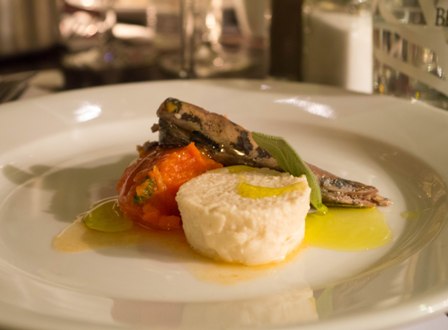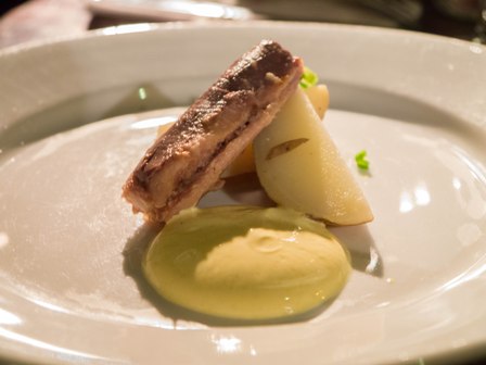 Jednak przebojem tego wieczoru były moim zdaniem Mini-makrelki na puree dyniowym z szałwią i chrzanową panna cottą,podawanezportugalskim Amarante, 2011, Vinho Verde DOC. Okdrywcza chrzanowa panna cotta, którą warto nabierać po małym kawałeczku wraz z puree i makrelką, w przeciwnym razie przyćmi inne smaki. Naprawdę dawno nie trafiłam na tak udane połączenie smaków.