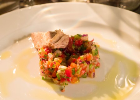 Tuńczyk na salsie z pomidorów, ogórków, papryki i kolendry
