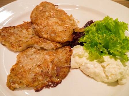 W drugiej kolejności zamawiam przekąskę. Głównie dlatego, że jeszcze nigdy czegoś takiego nie jadłam. Placki z kiszonej kapusty podane na ciepło z cebulką balsamiczną i musem z sera koziego (16 zł). To jest po prostu hit. Placki zrobione są dokładnie na takiej zasadzie jak placki ziemniaczane, ale zamiast ziemniaków występuje kiszona kapusta. Do tego idealnie komponuje się lekko słodkawa konfitura z cebulki balsamicznej. Mus z sera koziego, choć pyszny, zostaje dla mnie w tle. Kompozycja tych dwóch poprzednich smaków – kwaskowatych placków i słodkiej cebulki – jest strzałem w dziesiątkę.