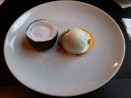 Przy deserach – które pomimo dużego już przejedzenia po prostu musimy tu zjeść – chwila zastanowienia. Właściciel poleca Tiramisu, a ja mam ochotę na Tortino saldo al cioccolato czyli Czekoladowy soufflet na ciepło. Niemniej jednak, ponieważ jadłam już około stu sufletów w innych miejscach, przygotowanych z gotowców, dokładnie takich samych, zadałam wyraźne pytanie, czy ten suflet jest robiony na miejscu. Po potwierdzeniu zamówiłam. Dzięki Bogu. To był znakomicie pyszny, prawdziwy suflet, a do niego śmietankowe lody na plasterku pomarańczy. Pożarłam wszystko do ostatniego kawałeczka pomarańczy.
