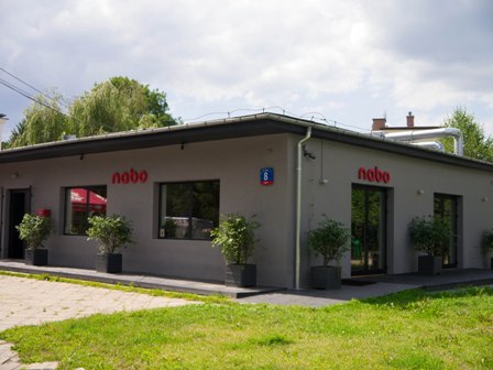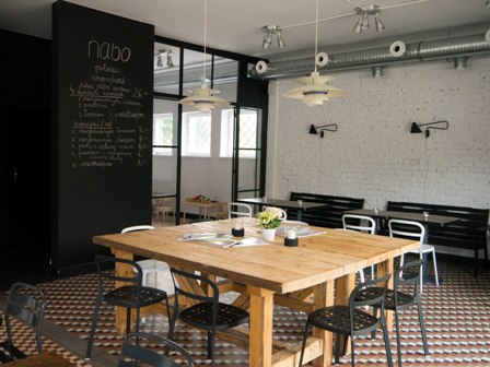 Miejsce jest położone w przepięknej lokalizacji na warszawskiej Sadybie, niedaleko Jeziorka Czerniakowskiego, tuż przy Placu Starszych Panów. Na dodatek, a to wielka korzyść dla Nabo, w okolicy pustynia kulinarna. Wystrój bardzo skandynawski – pełny minimalizm. Szare ściany zewnętrzne. Wewnątrz proste stoły, jeden duży centralny, reszta – dwuosobowe pod ścianami, regały z książkami z Ikei, mała duńska flaga zatknięta przy barze, wielka czarna tablica do pisania kredą, lustro i kilka kolorowych plakatów. To prawie wszystko, jeszcze może żyrandol z butelek z białego szkła. No i oczywiście obowiązkowe leżaki z logotypem Nabo na zewnątrz.