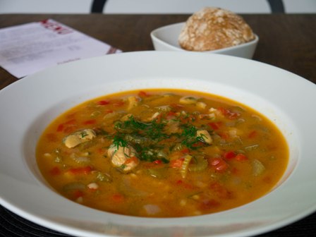 Wpadam w porze lunchu, bo mam niedaleko. Na wstępie okazuje się, że nie można jeszcze płacić kartą, co rujnuje moje zapędy głodomora, a na dodatek ogranicza do wyboru tylko jednego dania z dość interesującej karty. Wybieram Skandynawską zupę rybną. Przychodzisolidna porcja bardzo treściwej zupy. Wywar przygotowany na łososiu i dorszu, z mulami, pomidorami, selerem naciowym, koperkiem i drobnym makaronem. Do tego bułka z duńskim (a jakże!) masłem Lurpak. Pycha.